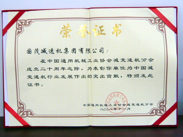 2008年,獲得中國減變速機行業(yè)20年發(fā)展“突出貢獻獎”